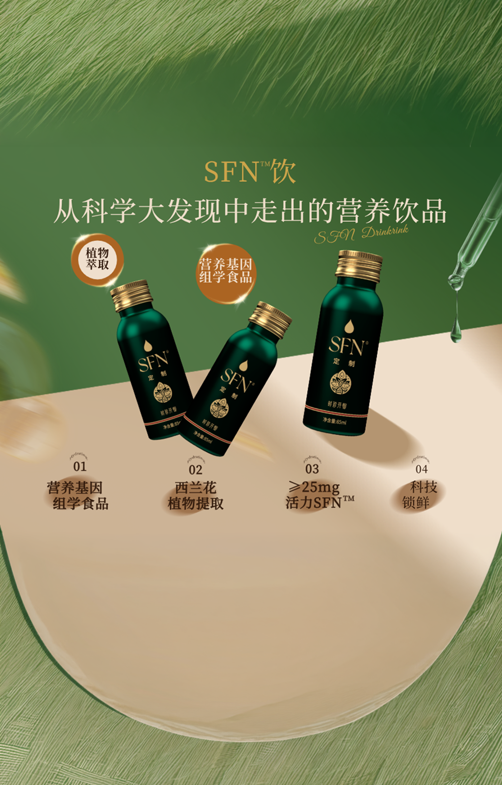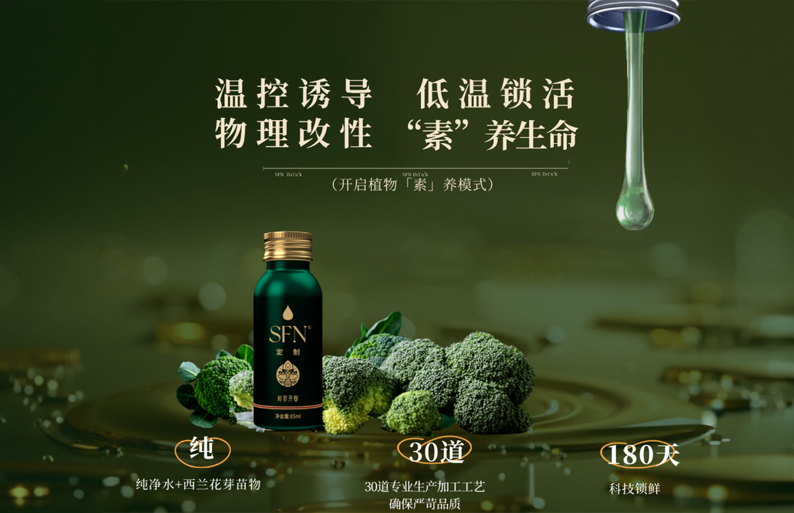 SFN®饮是一款以天然西兰花芽苗提取物为核心原料研发的植物活性营养饮品。产品通过植物科学研究成果转化,将西兰花中珍贵的天然活性分子——**萝卜硫素(Sulforaphane, SFN)**稳定保留并标准化呈现,使其能够以更科学、更稳定的形式融入日常饮用场景。