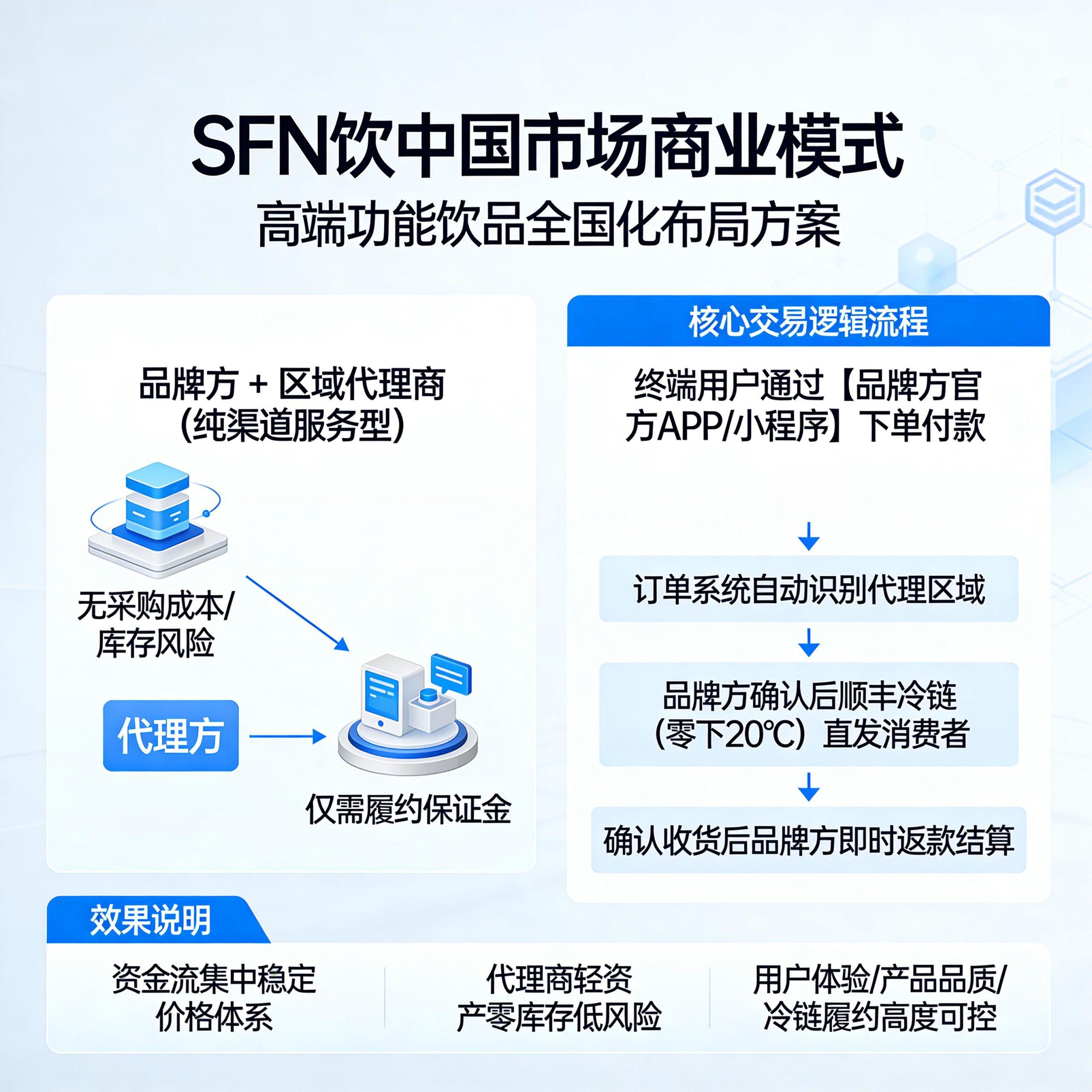 为确保资金安全、价格统一与合规运营,SFN饮在中国市场实行**“品牌方统一收款+代理分佣结算”的结算机制,代理商全程不接触任何产品销售款项**。